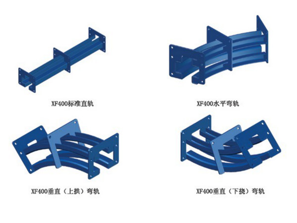 XF400型輸送機軌道包括標準直軌、水平彎軌、垂直彎軌、檢查軌、熱伸縮軌等。軌道由優(yōu)質(zhì)鋼板壓制成型,標準軌道長度6000,軌道兩邊裝有安裝括架,軌道中間每600裝有定位括架,軌道連接可以用螺栓連接,也可以將兩端的括架焊接連接。
